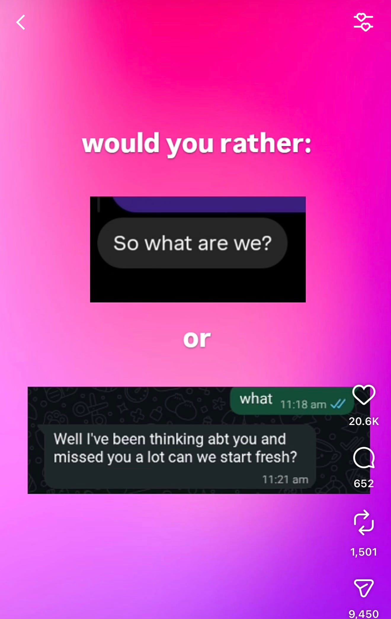 I’ve been thinking about ambiguity after my Instagram feed has become flooded with a very specific type of post: a wall of text either decrying, acknowledging, or celebrating a “situationship”. Some ask rhetorical “would you rather” type questions where one answer is cartoonishly violent and the other is about your situationship taking a day to respond. Others are character descriptions specific enough to be a tool for the viewer: hit like and maybe that person will see. Maybe you need your own motorcycle and then, and only then, will this ambiguity become tolerable.